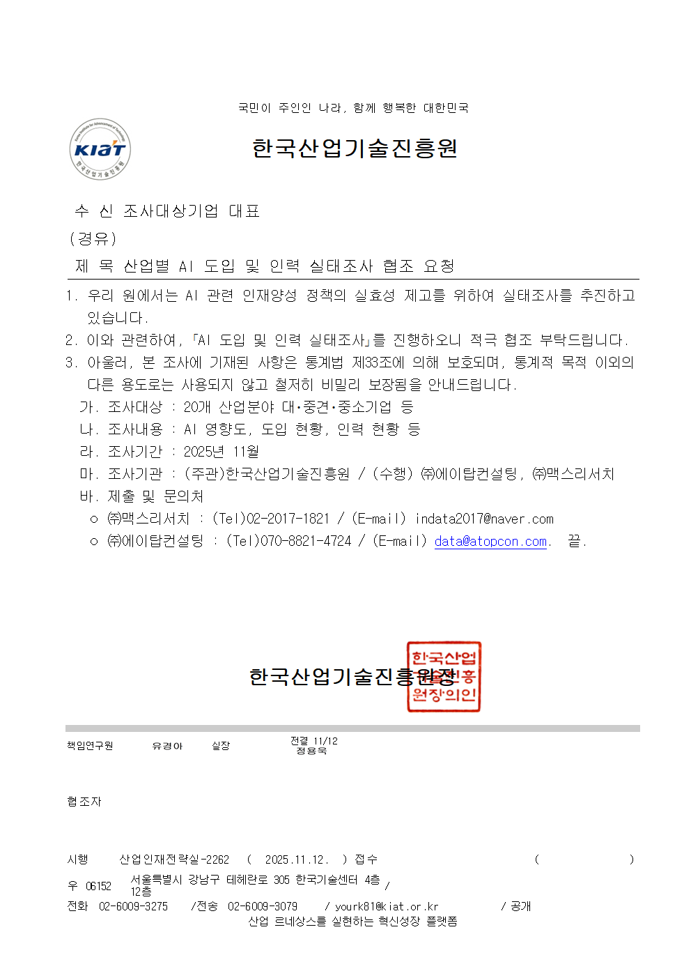 한국산업기술진흥원(KIAT)에서는 산업별 AI 인력 활용 실태를 파악하기 위해 관련 기업 관계자를 대상으로 ’산업별 AI 도입 현황 및 수요조사‘를 실시하고자 합니다.